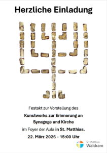 Allgemein Neues Kunstwerk: die Verbindung von Juden- und Christentum [vc_row][vc_column width=“2/3″][vc_column_text css=““] Eine sehenswerte Bereicherung und Verschönerung von St. Matthias:Die Künstlerin Johanna Widmann hat im Foyer der Aula von Zum Artikel Januar 14, 2026